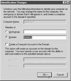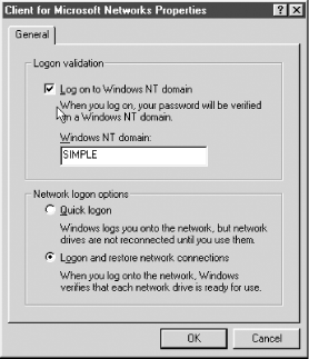 The client-side configuration for Windows clients is really simple. All you have to do is switch from workgroup to domain networking by enabling domain logons, and in the case of Windows NT/2000/XP, also provide the root password you gave smbpasswd for creating computer accounts. This results in the Windows NT/2000/XP system becoming a member of the domain.