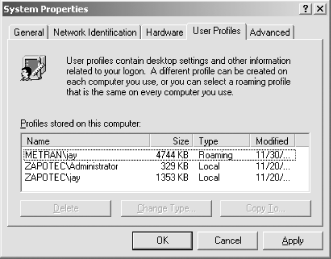 In addition to the domain features of that we discussed in Chapter 1, having a domain makes it possible to use logon scripts and roaming profiles (also called roving profiles). A logon script is a text file of commands that are run during startup, and a profile is a collection of information regarding the desktop environment, including the contents of the Start menu, icons that appear on the desktop, and other characteristics about the GUI environment that users are allowed to customize. A roaming profile can follow its owner from computer to computer, allowing her to have the same familiar interface appear wherever she logs on.