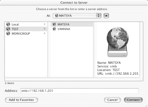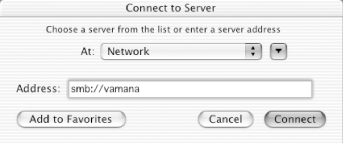 In addition to smbutil and mount_smbfs, OS X includes a graphical interface to the functionality they provide. To use this interface, open the Go menu and select the Connect to Server . . . menu item. Instead of using a UNC, specify the share in the form of a Uniform Resource Identifier (URI) with a prefix of smb:// entered in the Address field, as shown in Figure 5-5.